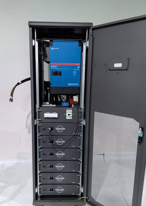 Het cabinet bevat drie Victron MultiPlus-II omvormers en levert een vermogen van 9 of 15 kVA, met monitoring via een Cerbo GX en GX Touch 50-display.