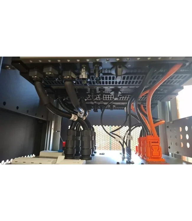 Het All-in-One Cabinet heeft een slim distributiesysteem dat zowel de AC- als DC-bekabeling ordelijk en overzichtelijk houdt. Dankzij het slimme ontwerp komen er slechts twee 5-aderige AC-kabels uit de linker of rechter buitenzijde van het cabinet, wat de installatie eenvoudig maakt. Deze AC-kabels verbinden het cabinet met de meterkast, en een installateur kan dit eenvoudig uitvoeren.